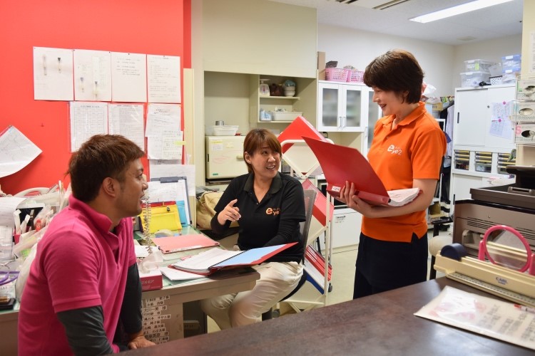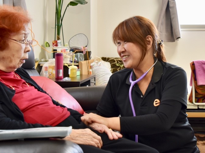 2000年に始まった介護保険制度。楠さんは2002年に、NPO法人あいあいに入社しました。パートのヘルパーから出発し、17年経った現在は副理事長に。人手不足の部署への異動を買って出て、30代でケアマネージャー・介護福祉士の資格を取得。38歳の時には看護学校に入学。最近では、関連会社の株式会社OCK Ba-miが運営する飲食店に出勤することも。「朝には注射を打ち、昼にはうどんを打つ。面白いでしょ」と笑い飛ばします。入社してからいつも、子育てとの並行作業でした。「とにかく楽しかったんです、仕事が。私が思い描いていた“介護”のイメージをガラリと変える、明るさと活気が『あいあい』にはありました」
