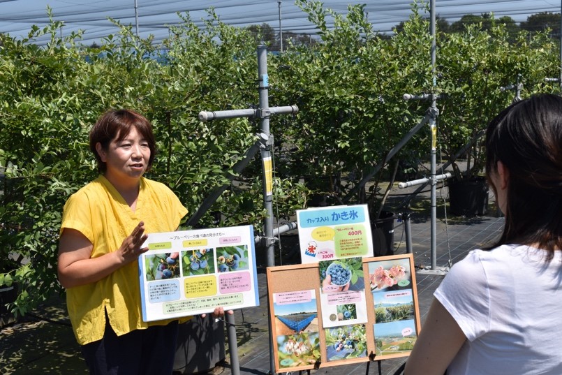毎年6~8月まで営業する観光ブルーベリー農園。ベビーカーも車椅子も通れる広い通路が整備され、防草シートが敷かれた平坦な地面は、女性のおしゃれ靴を汚すことはありません。「『観光農園を始めたいから力を貸して欲しい』と生産農家だった現夫に声を掛けてもらった時は、嬉しくて」。それまでは会社員として事務職に従事。「サービス業への思いは、いつもありました。けれどシングルマザーだったので、土日に働くのが難しくて」。子育てがひと段落した頃に巡ってきたチャンス。農業も観光農園も初めてでしたが「生産以外の運営管理を一任してほしい」と申し入れました。園内には山原さんのアイデアと心遣いがちりばめられています。